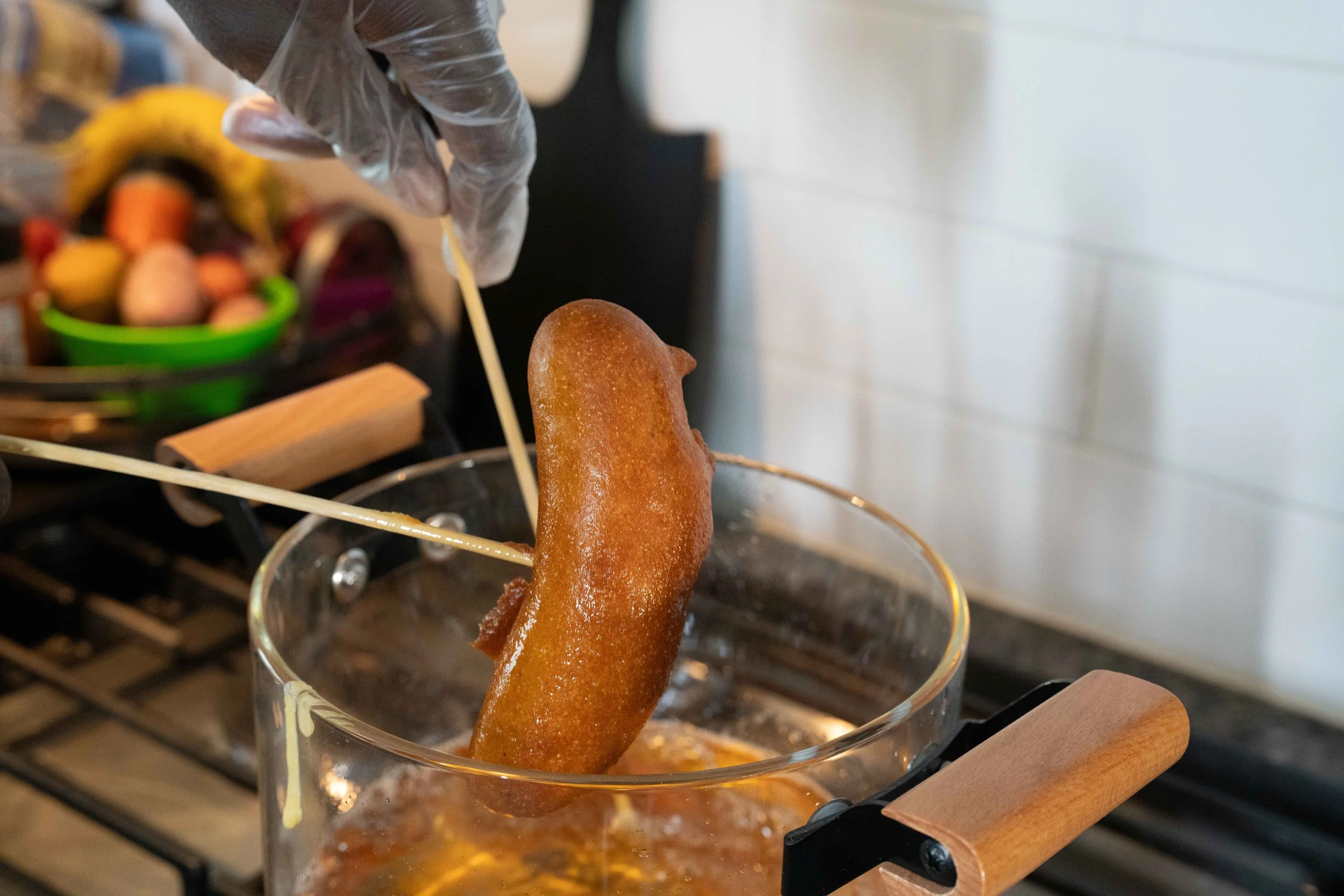 Dip each brat into the batter, ensuring they are completely coated. Allow any excess batter to drip off.